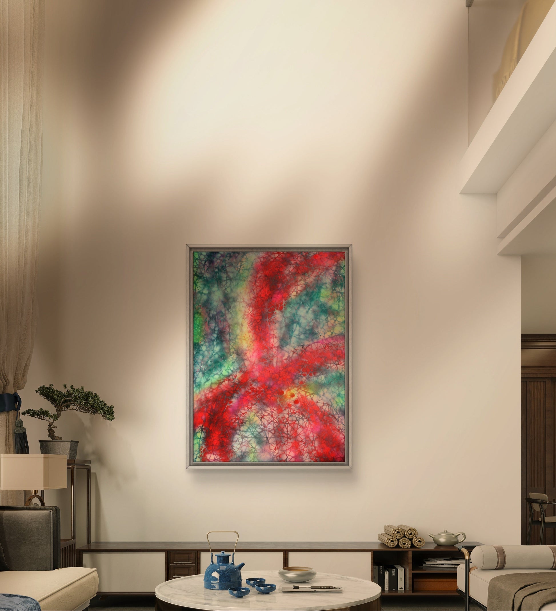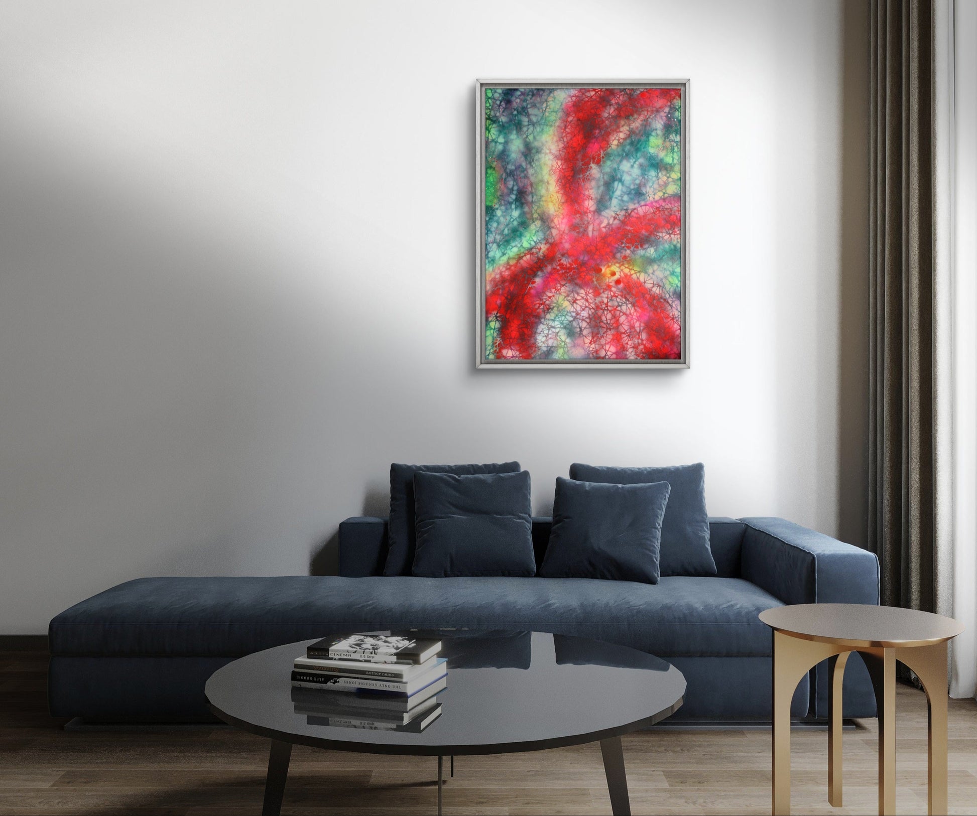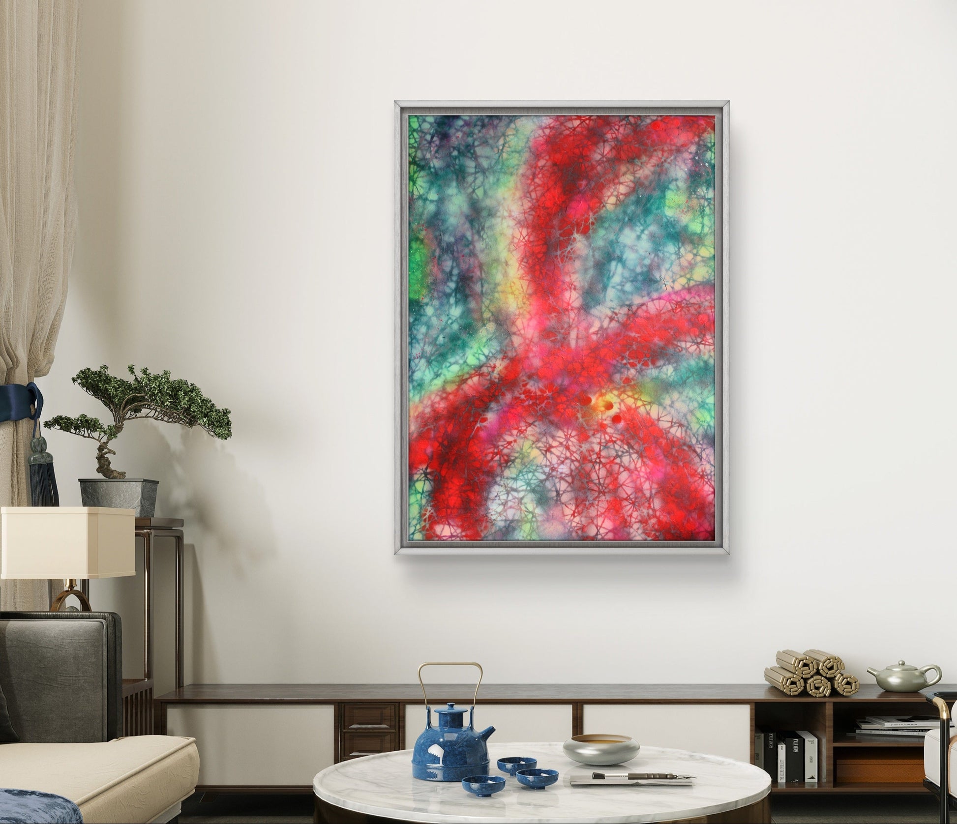 This captivating artwork blends vibrant acrylics with diverse materials to create a rich tapestry of texture and color. Each layer is meticulously applied, resulting in a dynamic composition that invites closer inspection. The interplay of various media adds depth and intrigue, offering a unique visual experience that evolves with every glance. The gallery wrapped canvas provides a seamless, modern finish, making it ready to hang and enjoy immediately. Perfect for contemporary art lovers, this one-of-a-kind piece brings a sophisticated and creative touch to any space, transforming your home or office with its bold presence and imaginative flair.