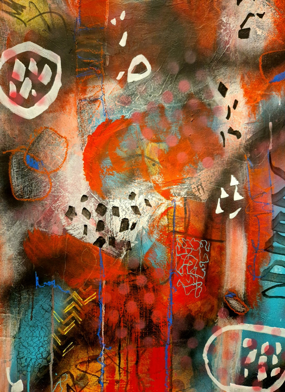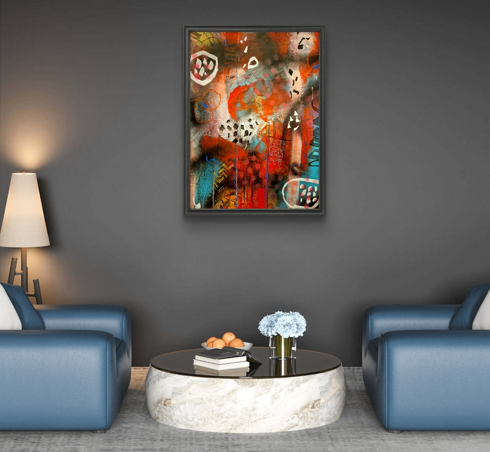 This captivating artwork blends vibrant acrylics with diverse materials to create a rich tapestry of texture and color. Each layer is meticulously applied, resulting in a dynamic composition that invites closer inspection. The interplay of various media adds depth and intrigue, offering a unique visual experience that evolves with every glance. The gallery wrapped canvas provides a seamless, modern finish, making it ready to hang and enjoy immediately. Perfect for contemporary art lovers, this one-of-a-kind piece brings a sophisticated and creative touch to any space, transforming your home or office with its bold presence and imaginative flair.